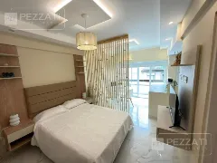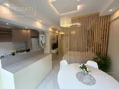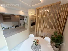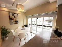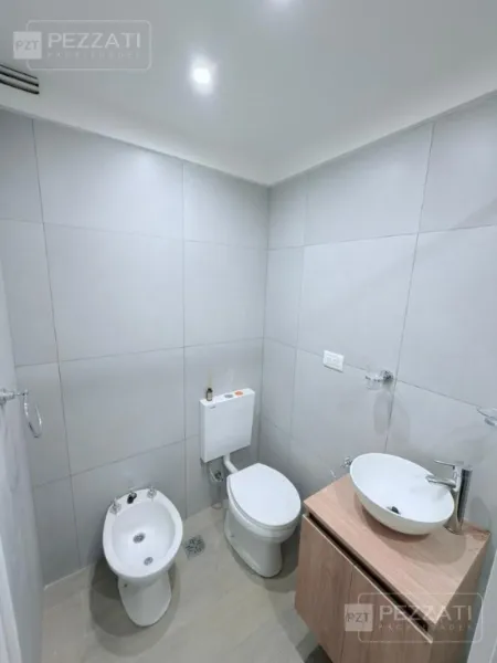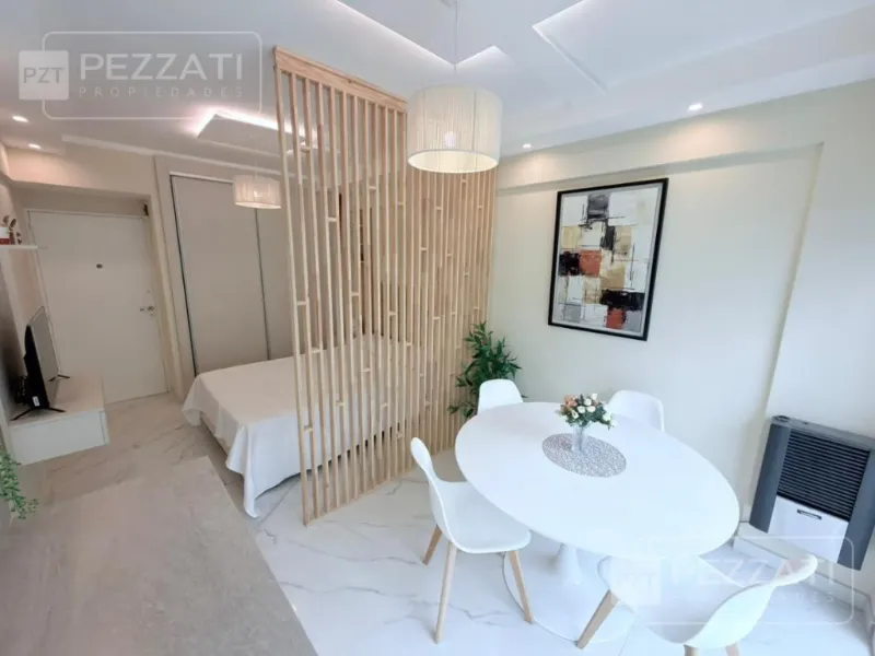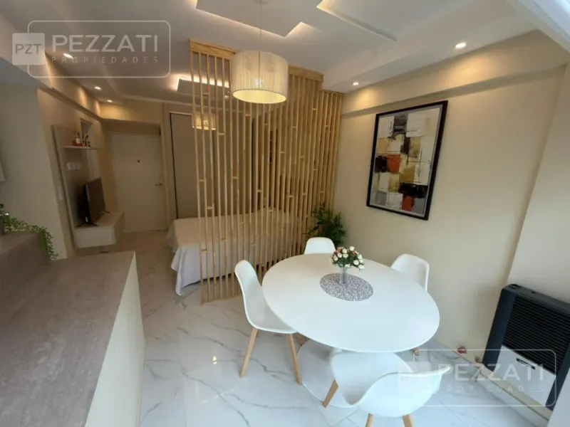 Al ingresar se encuentra la cocina integrada con barra desayunadora, que incluye muebles bajo mesada y un práctico lavarropas. El ambiente principal se extiende hacia un balcón saliente, protegido por cortinas blackout que garantizan privacidad y control de la luz.
