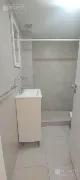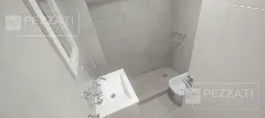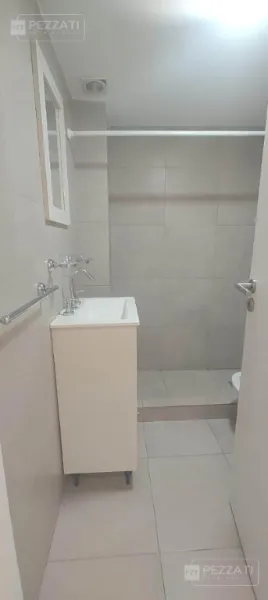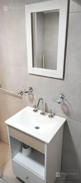 El mueble divisor de ambiente, hecho a medida en melamina blanca, maximiza la funcionalidad del espacio. El baño está completamente revestido en cerámicos y equipado con un vanitory, ducha y extractor de aire, asegurando comodidad y estilo.