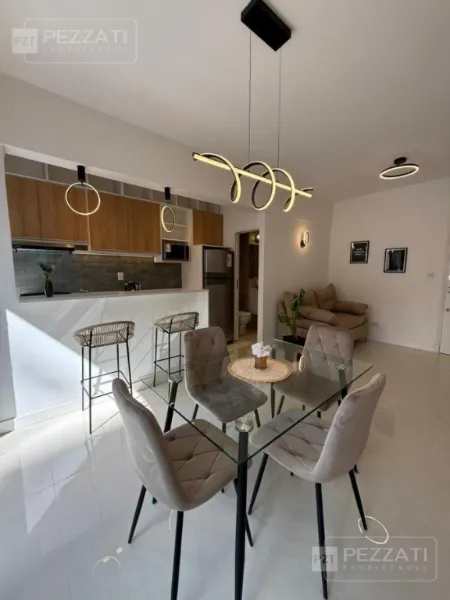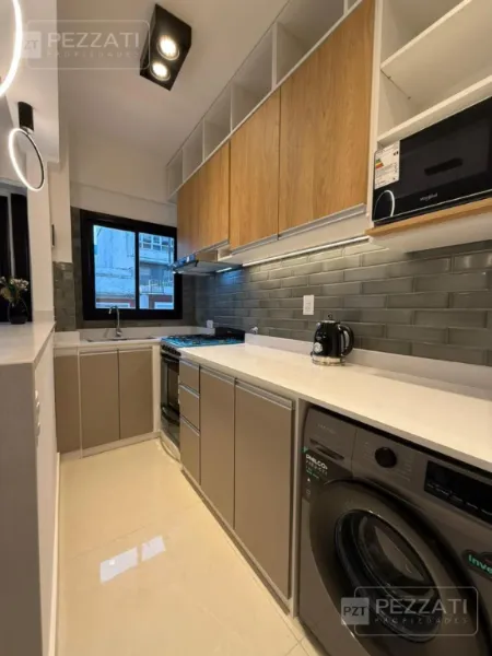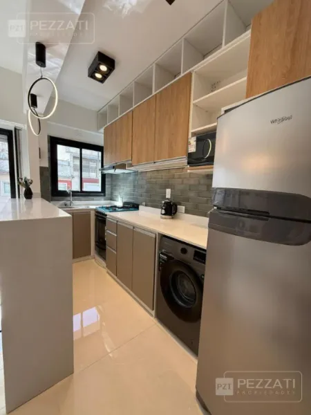 Cocina integrada con barra desayunadora, equipada con amoblamiento a medida y electrodomésticos. Ventilación natural.
